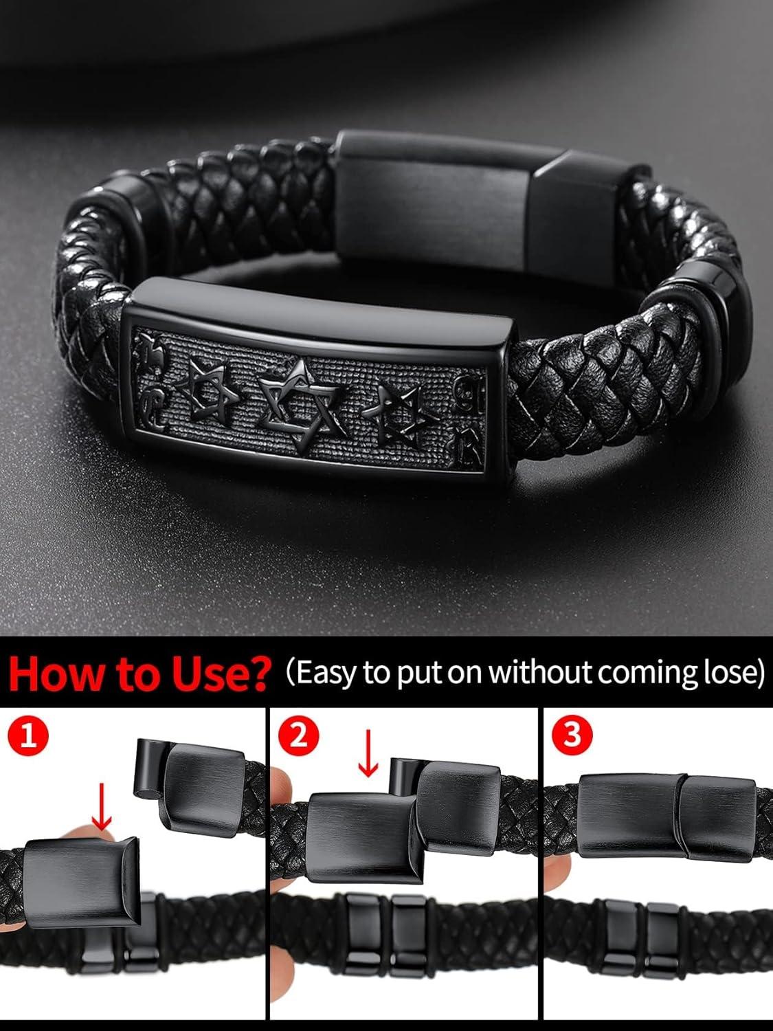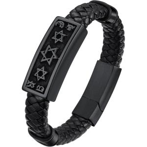 ChainsHouse Mens Wrap Braided Leather Black Bead Bracelets Bangles, Vintage Star of David/Wing Skull/Templar Cross Genuine Leather Bracelet, Customize Available, Size 7.5/8.3/9.0 Inch, Send Gift Box(A: Star of David-Black)