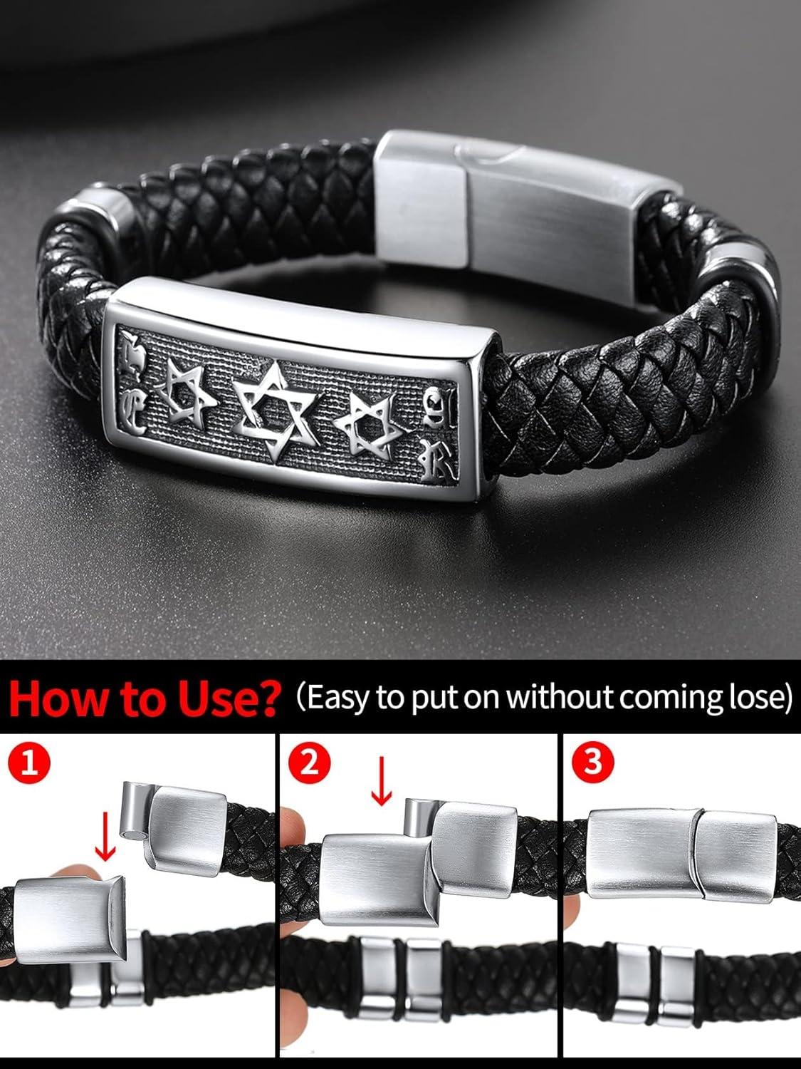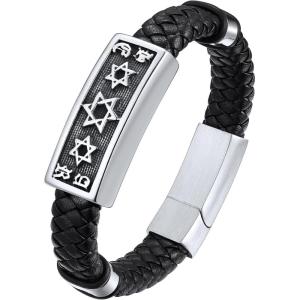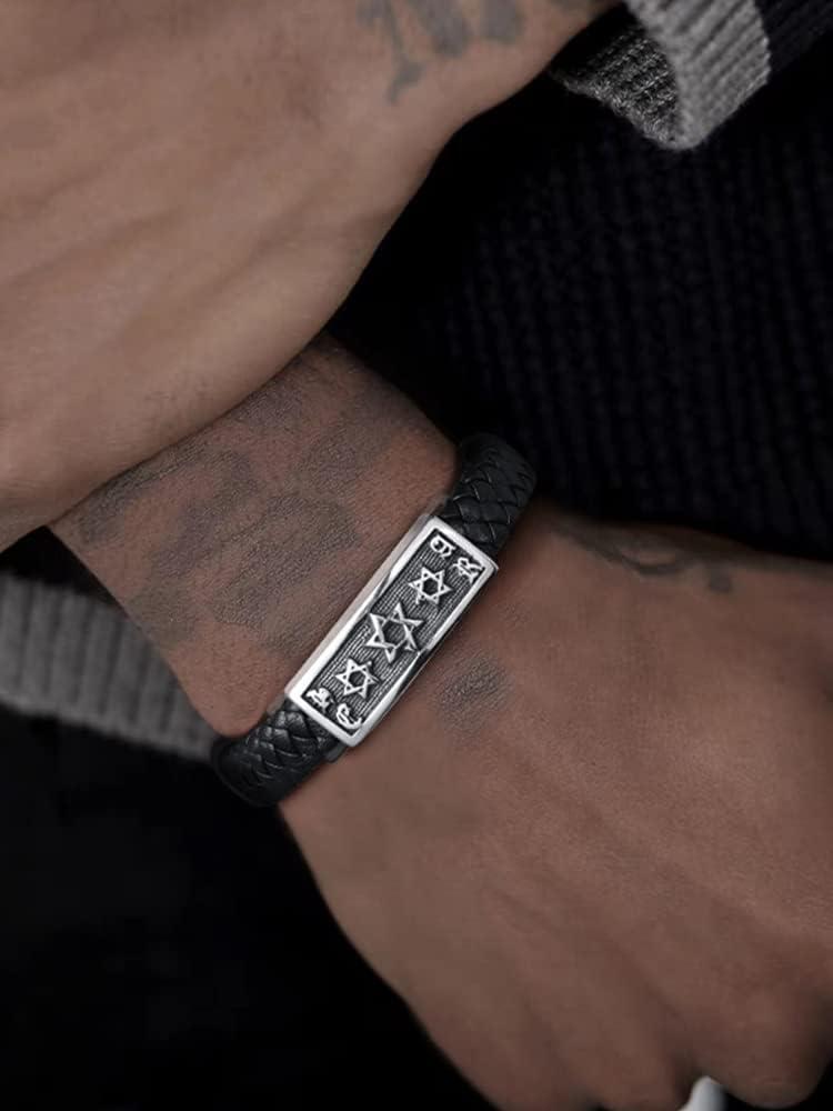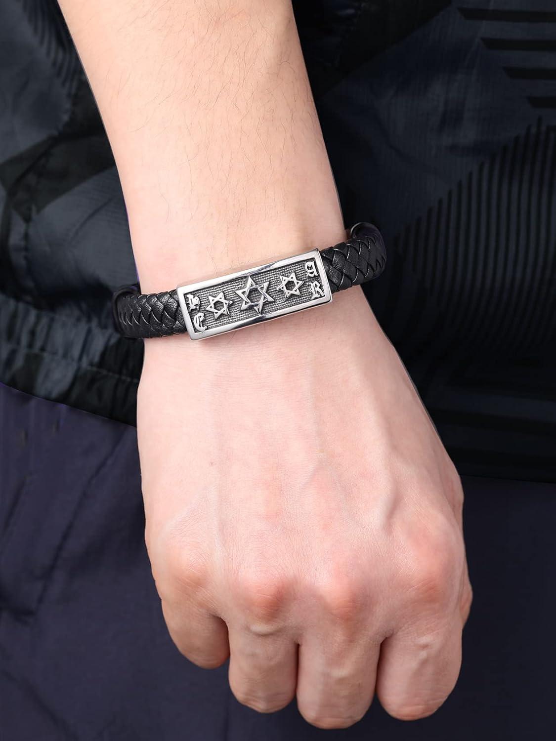 ChainsHouse Mens Wrap Braided Leather Black Bead Bracelets Bangles, Vintage Star of David/Wing Skull/Templar Cross Genuine Leather Bracelet, Customize Available, Size 7.5/8.3/9.0 Inch, Send Gift Box(B: Star of David-Steel-Custom)