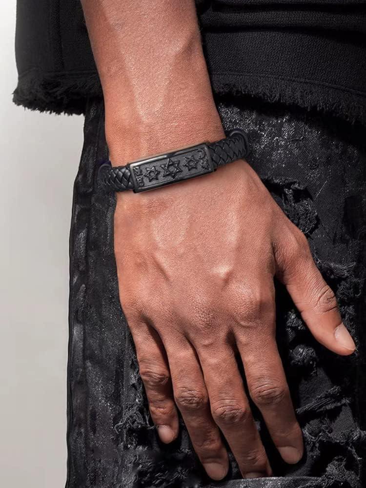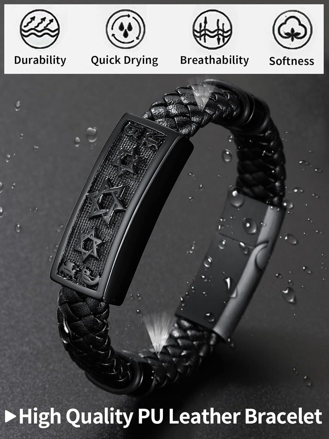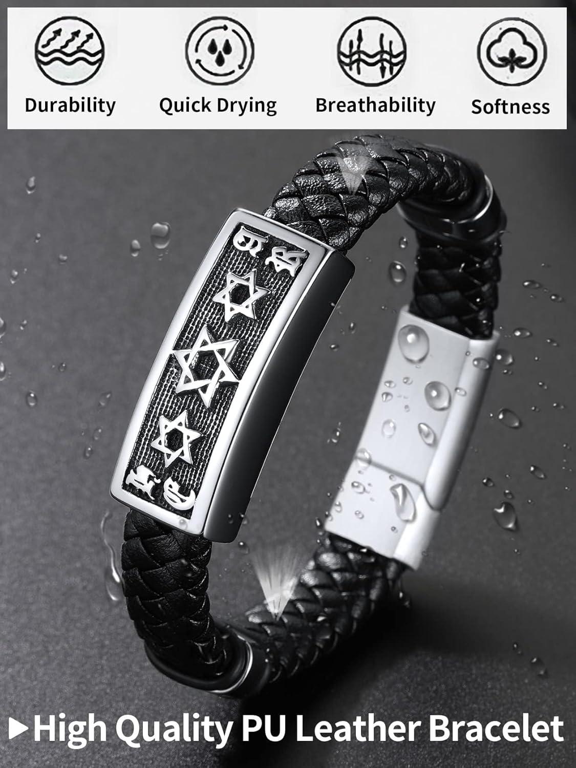 ChainsHouse Mens Wrap Braided Leather Black Bead Bracelets Bangles, Vintage Star of David/Wing Skull/Templar Cross Genuine Leather Bracelet, Customize Available, Size 7.5/8.3/9.0 Inch, Send Gift Box(B: Star of David-Steel-Custom)