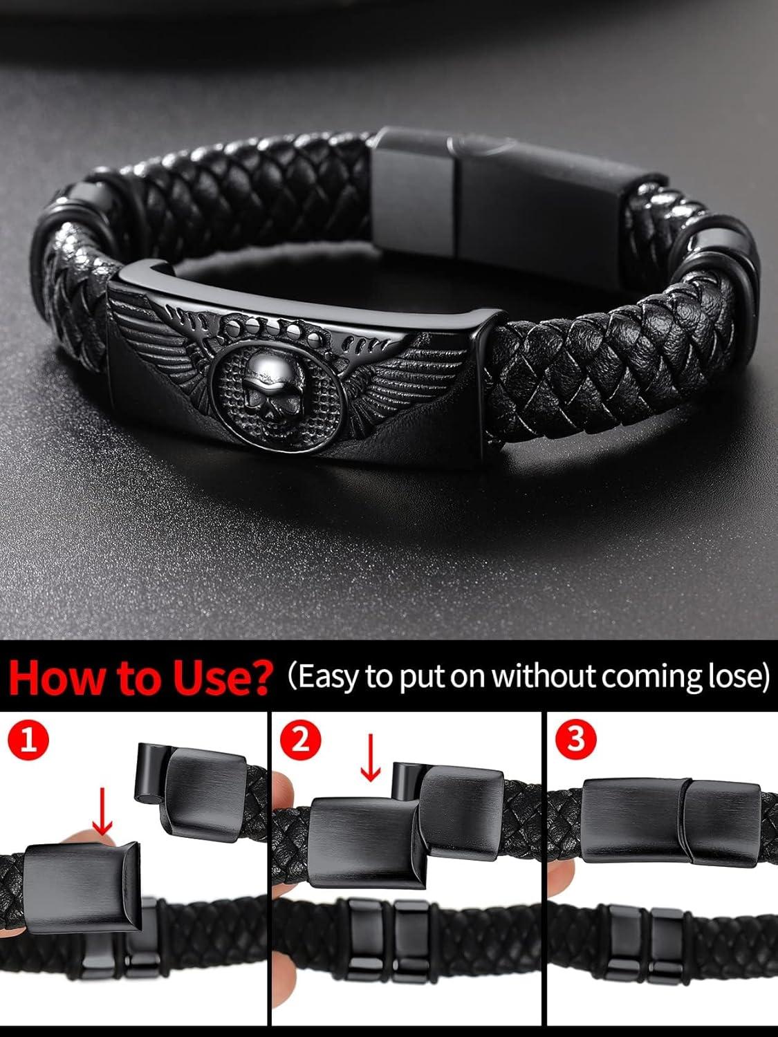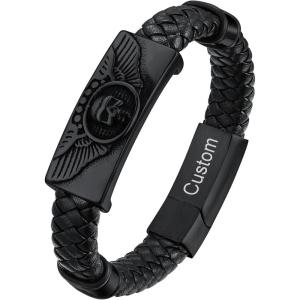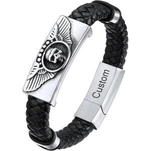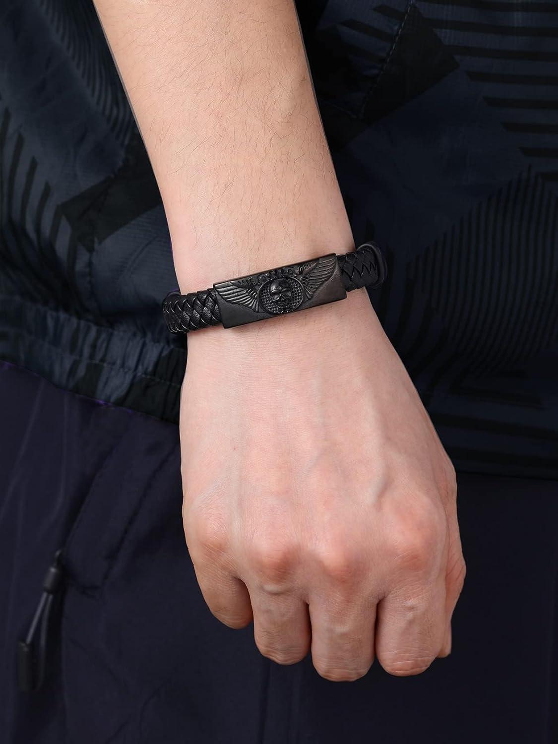 ChainsHouse Mens Wrap Braided Leather Black Bead Bracelets Bangles, Vintage Star of David/Wing Skull/Templar Cross Genuine Leather Bracelet, Customize Available, Size 7.5/8.3/9.0 Inch, Send Gift Box(B: Wing Skull-Black-Custom)
