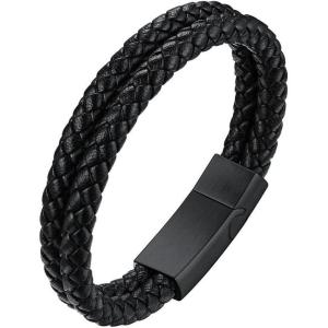 ChainsHouse Mens Wrap Braided Leather Black Bead Bracelets Bangles, Vintage Star of David/Wing Skull/Templar Cross Genuine Leather Bracelet, Customize Available, Size 7.5/8.3/9.0 Inch, Send Gift Box(A: Double Braided-Black Clasp)
