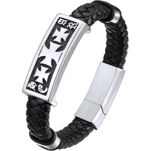 ChainsHouse Mens Wrap Braided Leather Black Bead Bracelets Bangles, Vintage Star of David/Wing Skull/Templar Cross Genuine Leather Bracelet, Customize Available, Size 7.5/8.3/9.0 Inch, Send Gift Box(B: Templar Cross-Steel-Custom)