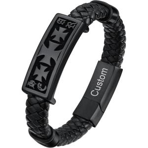 ChainsHouse Mens Wrap Braided Leather Black Bead Bracelets Bangles, Vintage Star of David/Wing Skull/Templar Cross Genuine Leather Bracelet, Customize Available, Size 7.5/8.3/9.0 Inch, Send Gift Box(B: Templar Cross-Black-Custom)