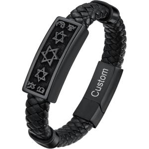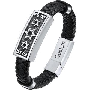 ChainsHouse Mens Wrap Braided Leather Black Bead Bracelets Bangles, Vintage Star of David/Wing Skull/Templar Cross Genuine Leather Bracelet, Customize Available, Size 7.5/8.3/9.0 Inch, Send Gift Box(B: Star of David-Black-Custom)