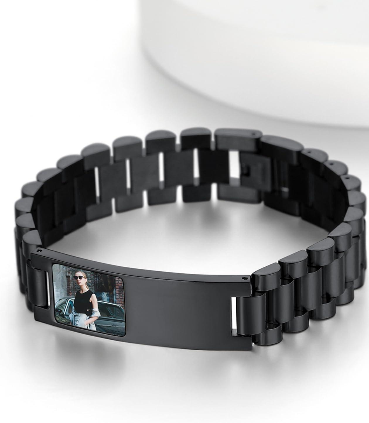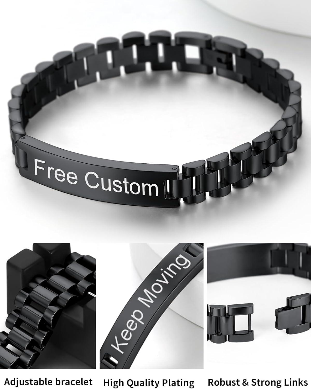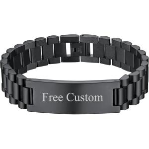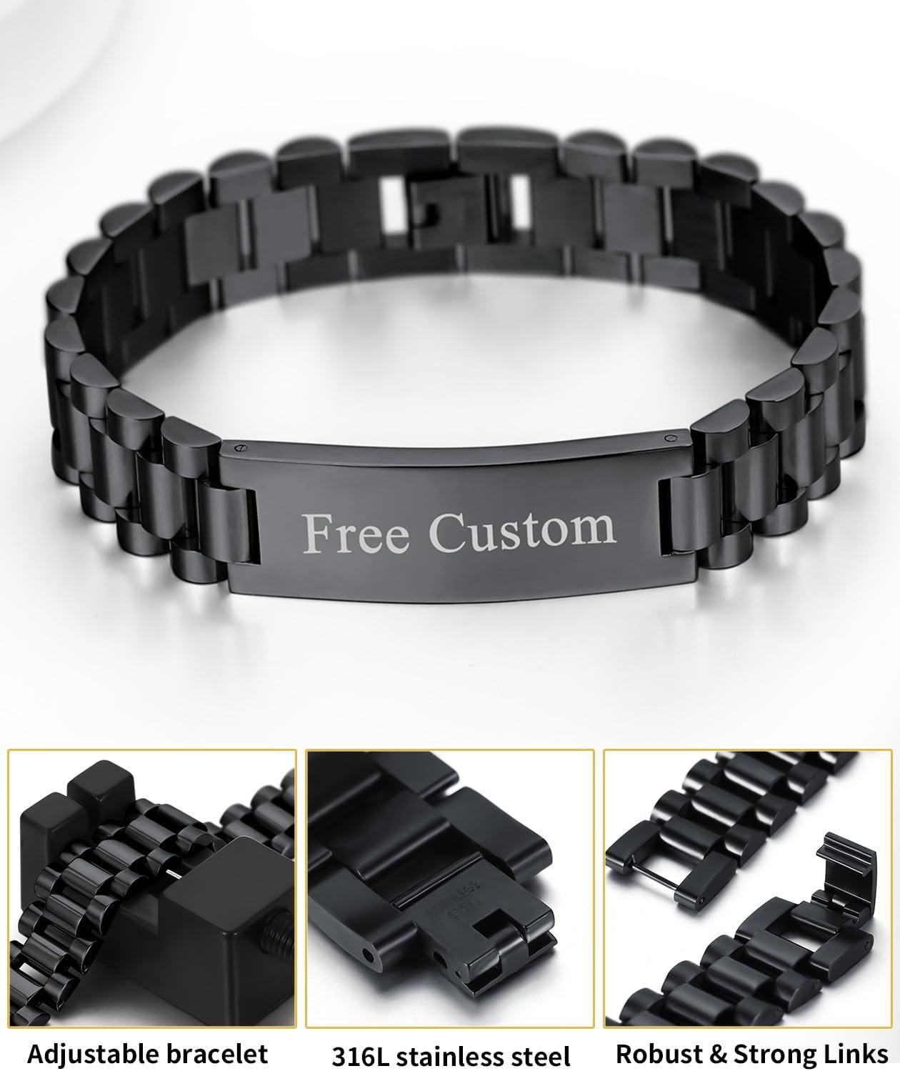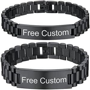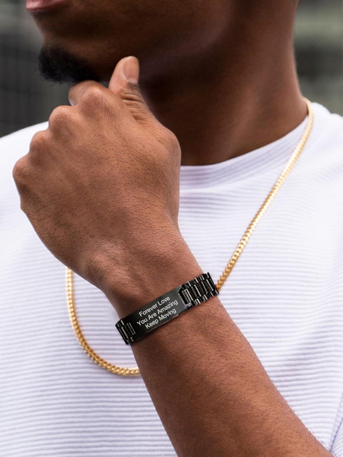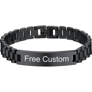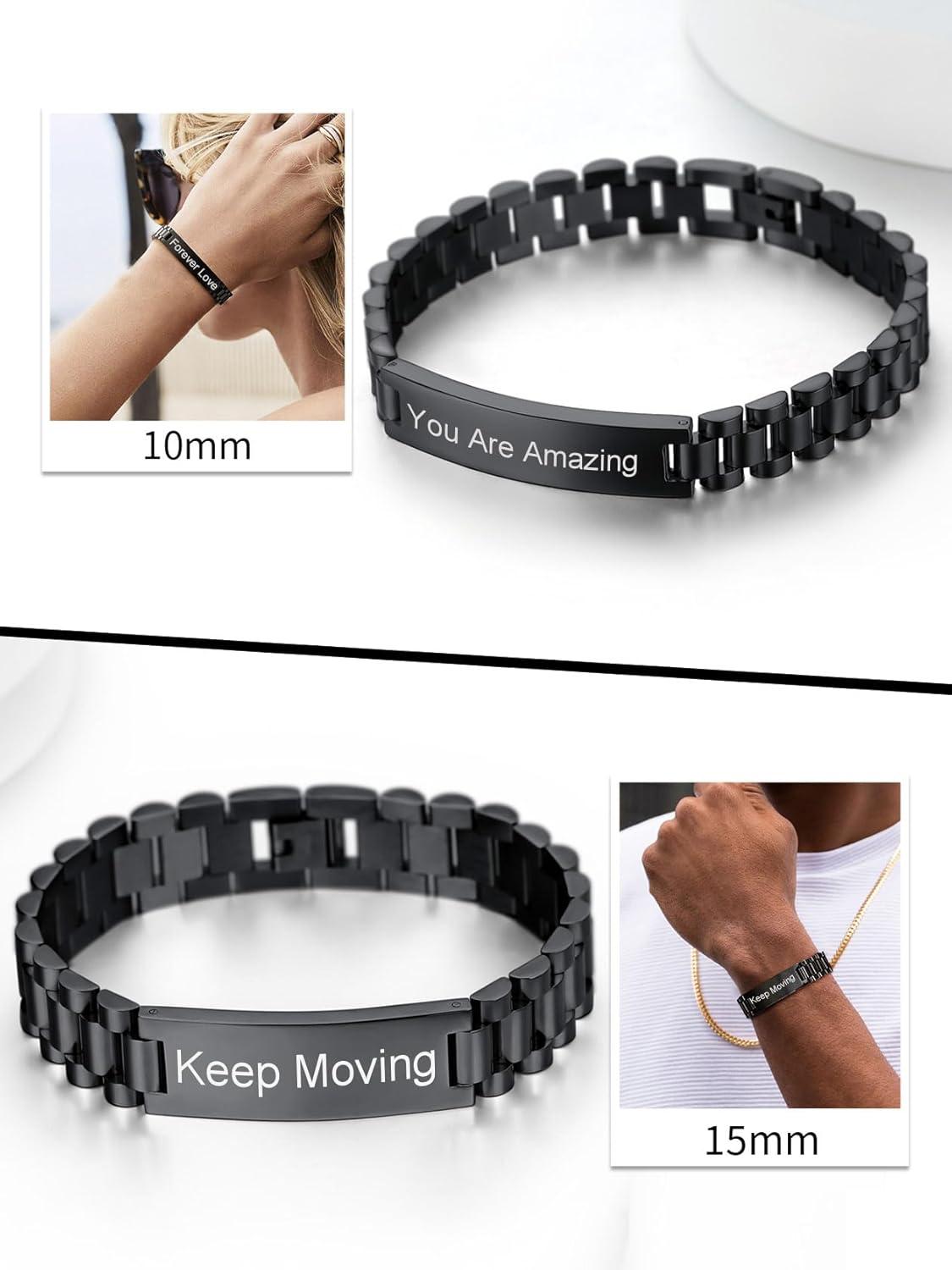 ChainsHouse Personalized ID Bracelet for Men Women Stainless Steel Cuban Curb Link Chain Custom Engrave Bar Bracelet Bangle, 7mm Width, 19-21CM, Send Gift Box(B: Black-15MM-Photo)