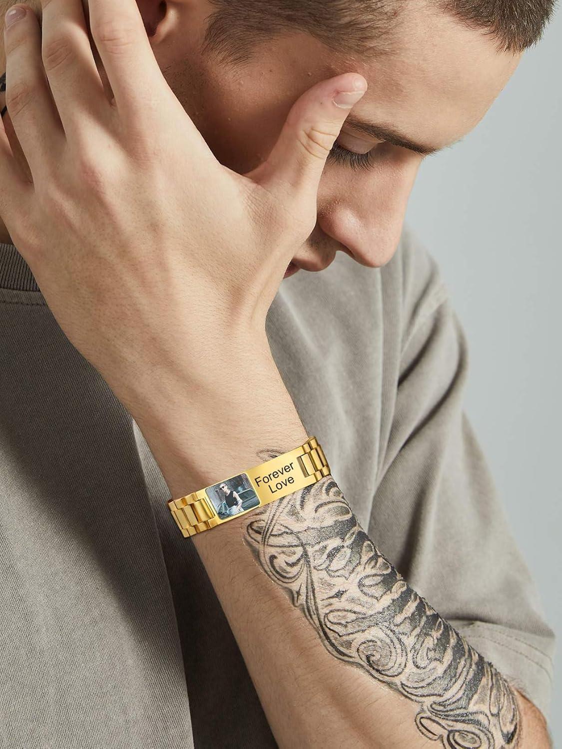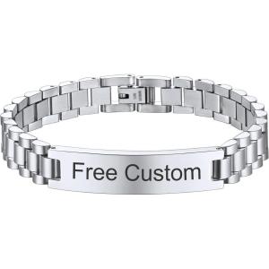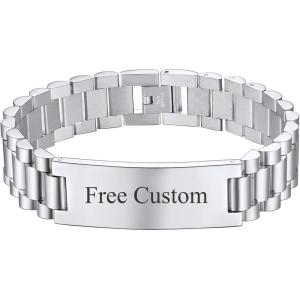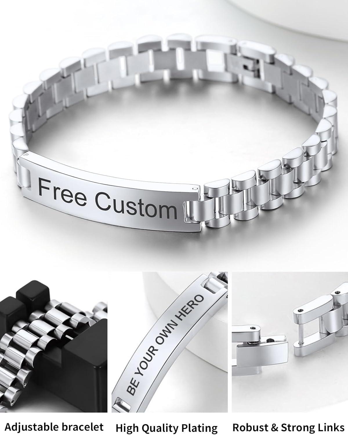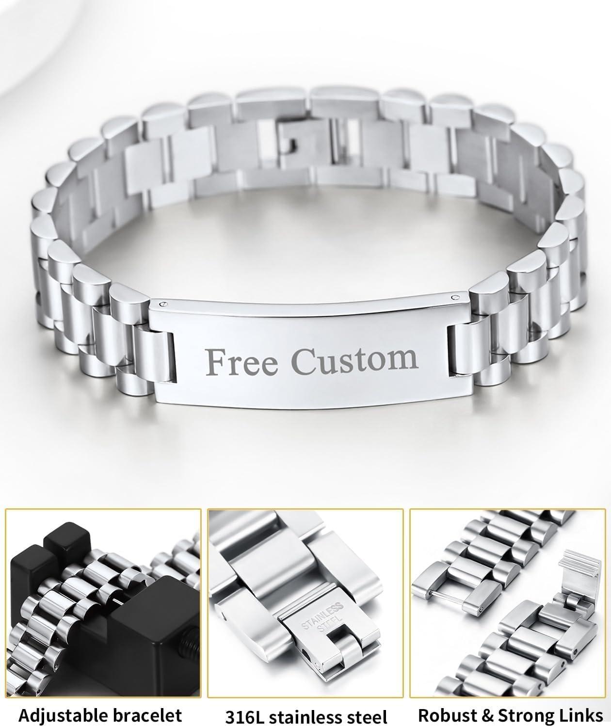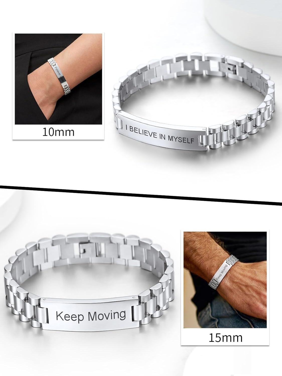 ChainsHouse Wristband ID Bracelets for Men, Stainless Steel/18K Gold/Black Metal Plated, Personalized Engrave Chunky Bracelet Bangle, with Removal Tool, 15MM/15.5MM Width, 8.27-8.66 Inch Length(j. 10mm width-Steel-Custom)