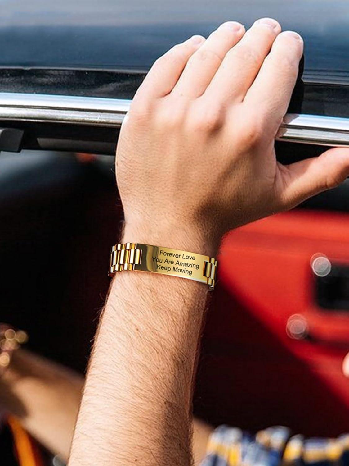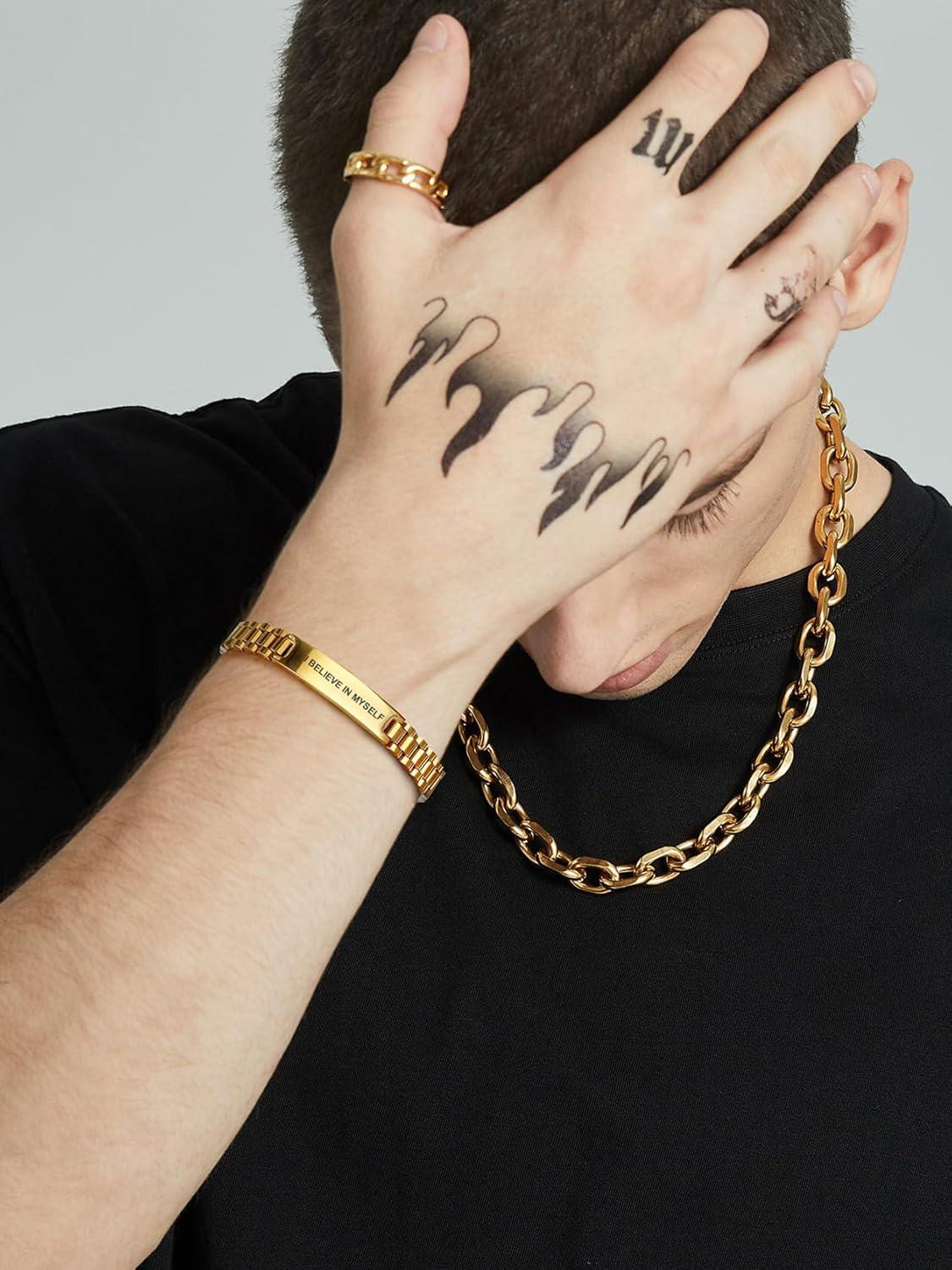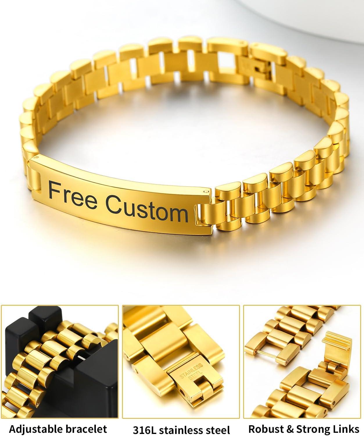 ChainsHouse Wristband ID Bracelets for Men, Stainless Steel/18K Gold/Black Metal Plated, Personalized Engrave Chunky Bracelet Bangle, with Removal Tool, 15MM/15.5MM Width, 8.27-8.66 Inch Length(l. 10mm width-Gold-Custom)