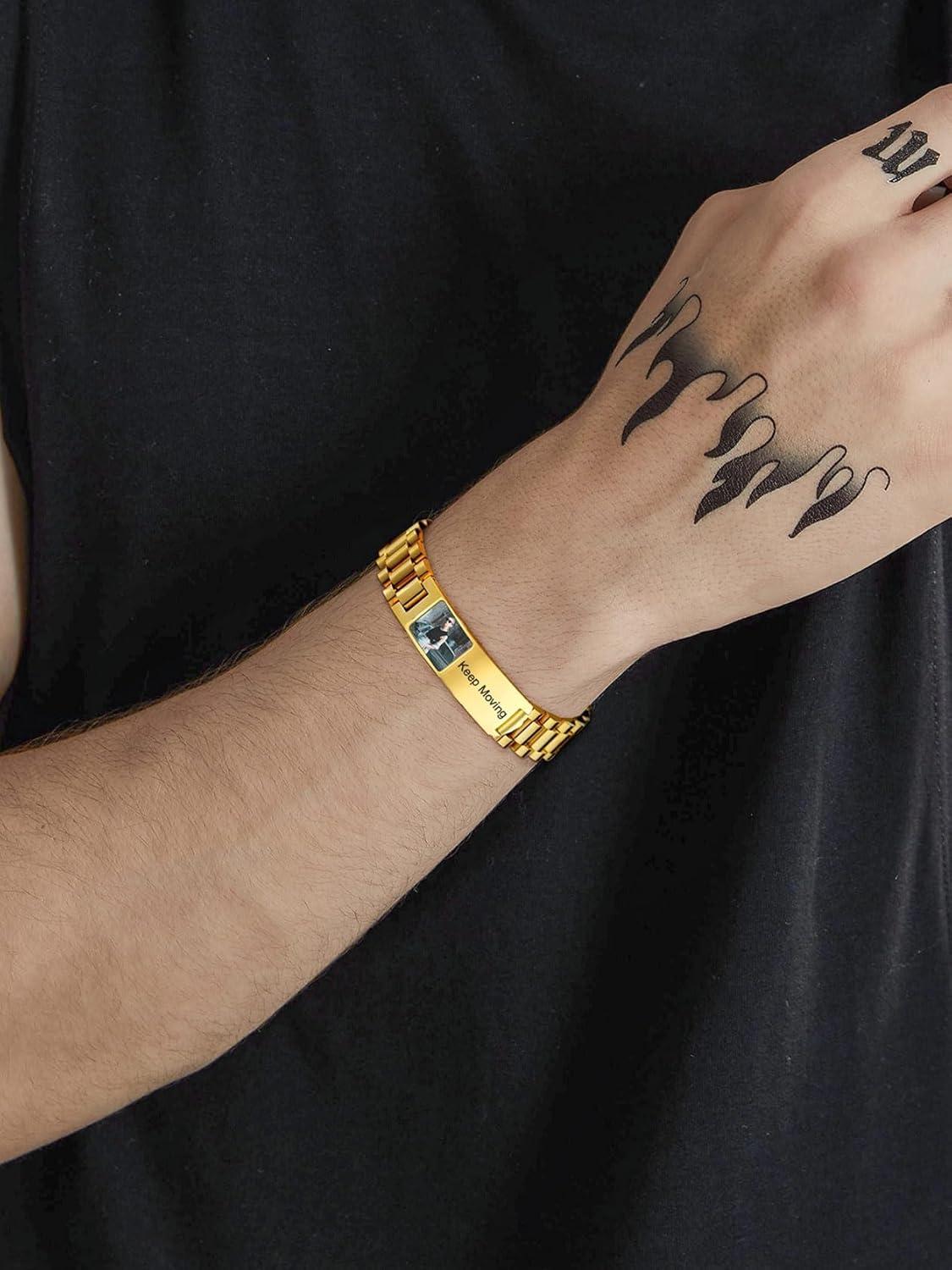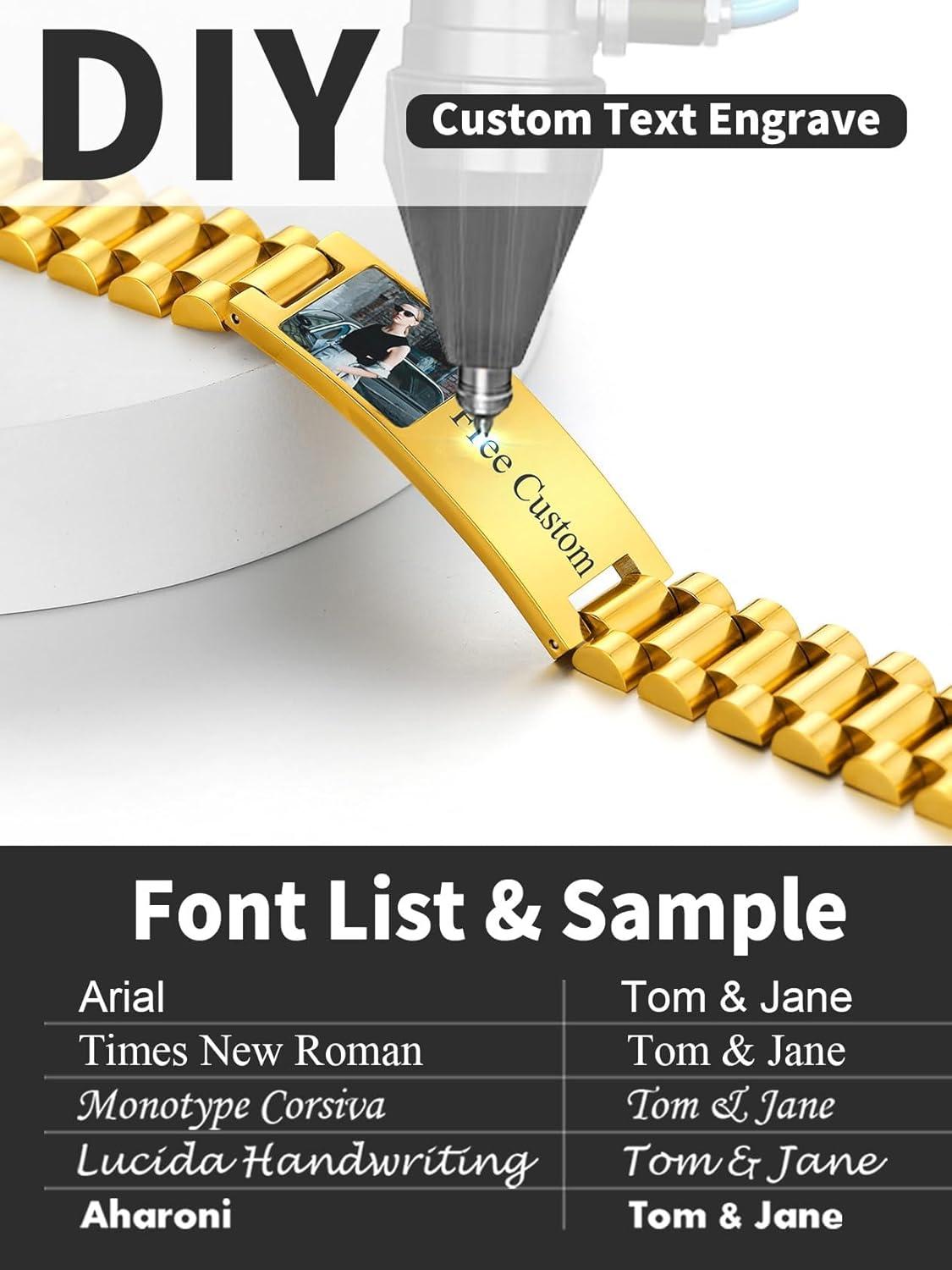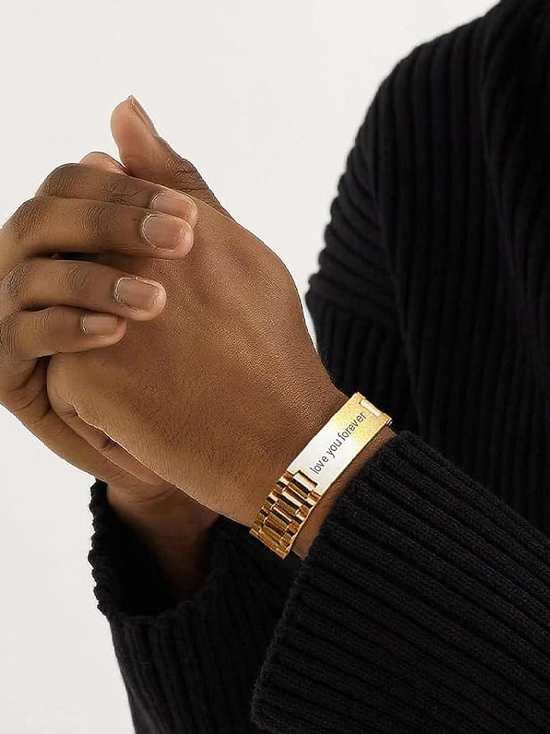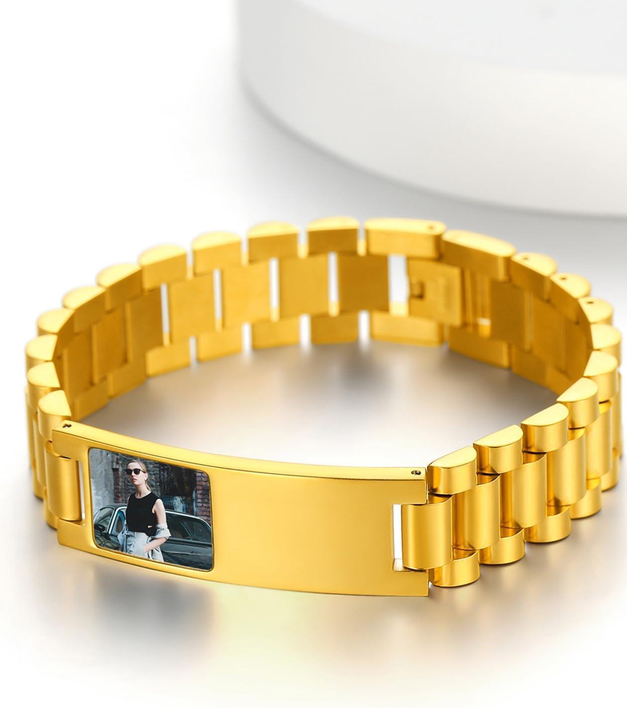 ChainsHouse Personalized ID Bracelet for Men Women Stainless Steel Cuban Curb Link Chain Custom Engrave Bar Bracelet Bangle, 7mm Width, 19-21CM, Send Gift Box(C: Gold-15MM-Photo)
