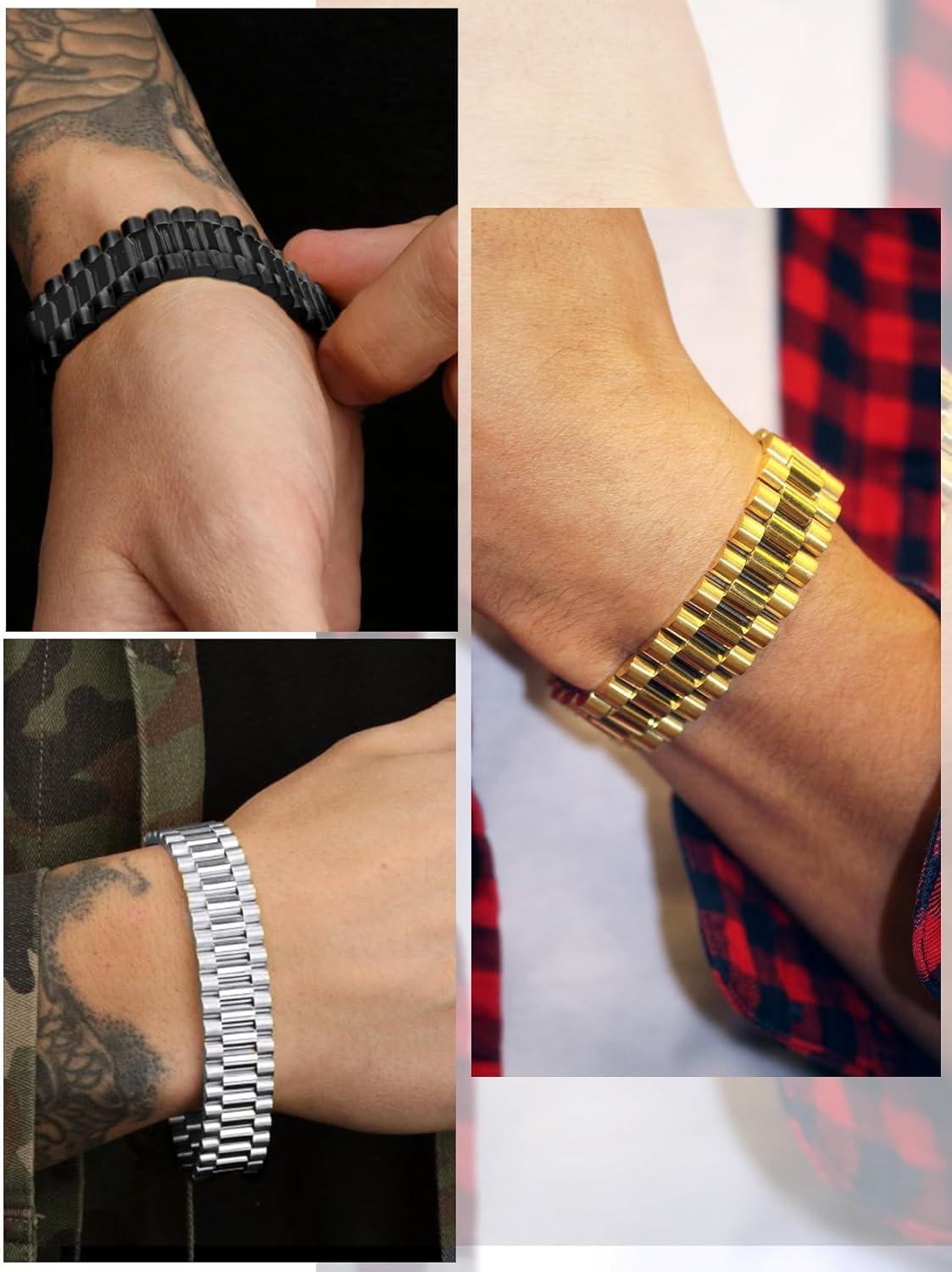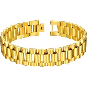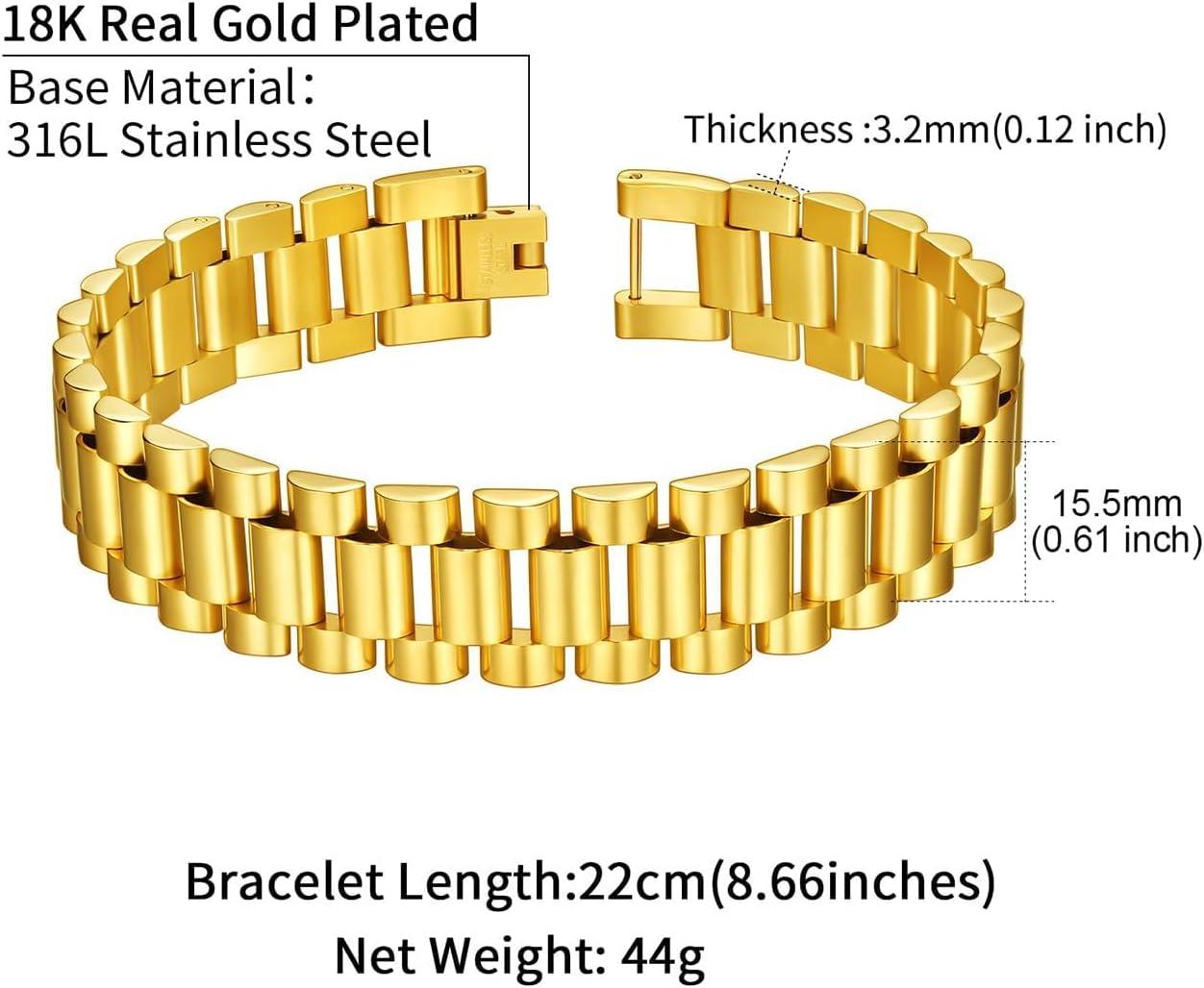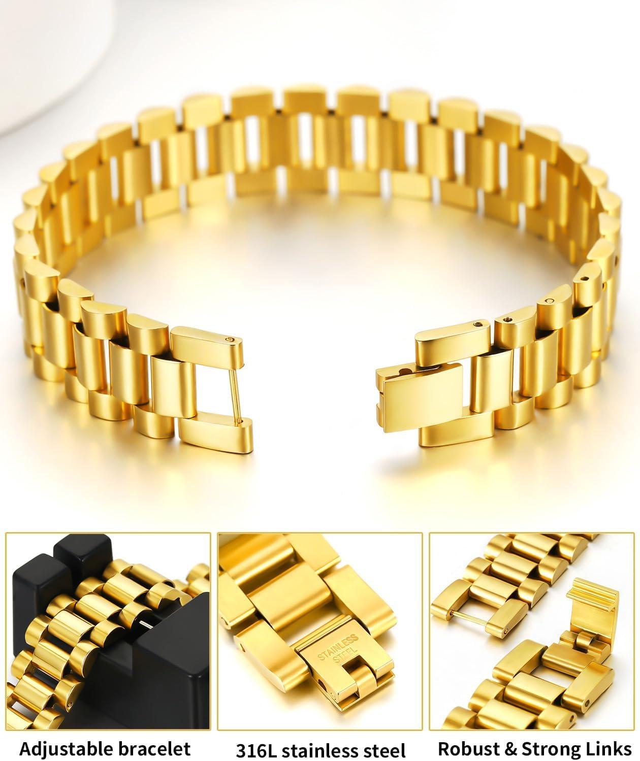 ChainsHouse Wristband ID Bracelets for Men, Stainless Steel/18K Gold/Black Metal Plated, Personalized Engrave Chunky Bracelet Bangle, with Removal Tool, 15MM/15.5MM Width, 8.27-8.66 Inch Length(i. 15.5mm width-Gold)